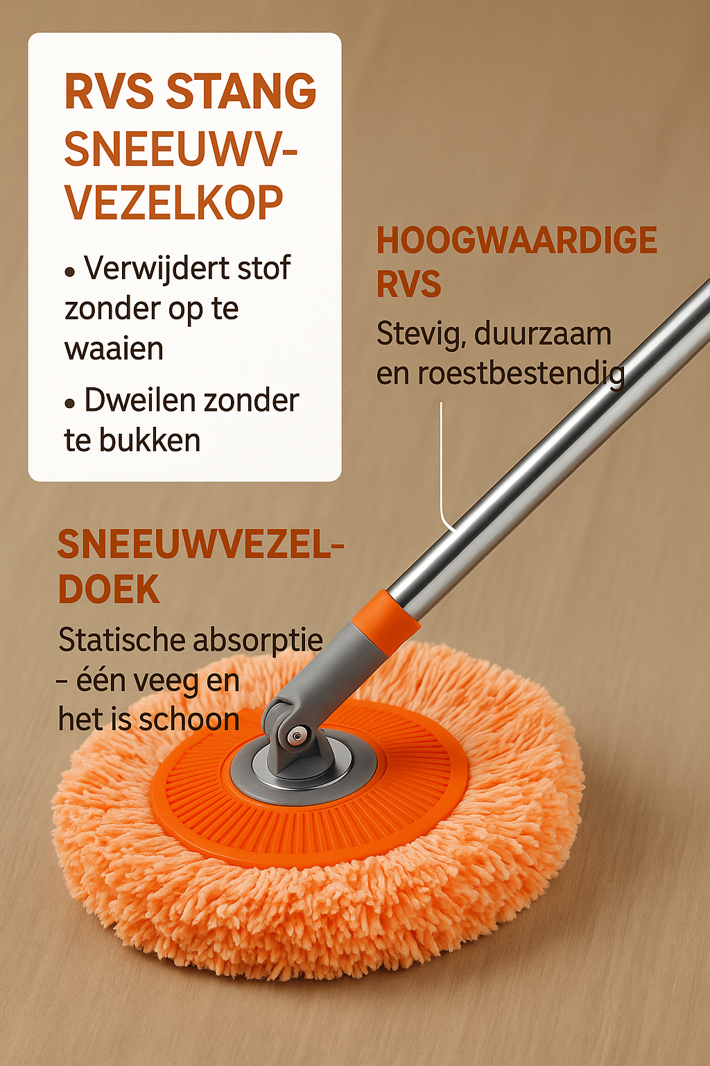 Hardnekkige vlekken en verborgen stof zijn geen partij voor de 360Mop™. De 360° roterende kop en de sterk absorberende microvezelpad werken samen om vuil op te nemen, stof vast te houden en elk oppervlak vlekkeloos schoon te maken – zonder te buigen, te weken of agressieve chemicaliën te gebruiken.